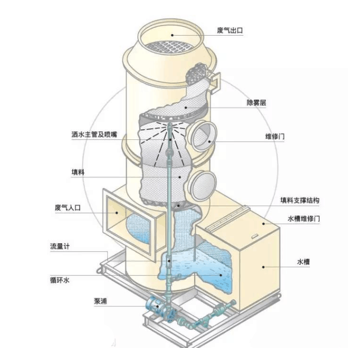 廢氣由風(fēng)管引入凈化塔,經(jīng)過(guò)填料層,廢氣與氫氧化鈉吸收液進(jìn)行氣液兩相充分接觸吸收中和反應(yīng),酸霧廢氣經(jīng)過(guò)凈化后,再經(jīng)除霧板脫水除霧后由風(fēng)機(jī)排入大氣。吸收液在塔底經(jīng)水泵增壓后在塔頂噴淋而下, 后回流至塔底循環(huán)使用。凈化后的酸霧廢氣達(dá)到廣東省地方排放標(biāo)準(zhǔn)的排放要求,低于國(guó)家排放標(biāo)準(zhǔn)。