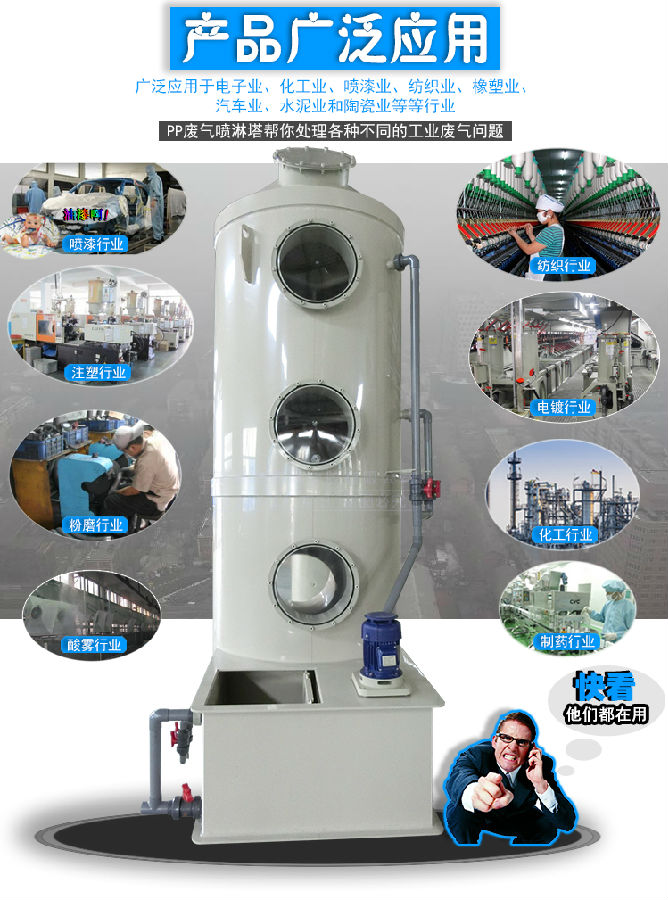 廣泛應(yīng)用于化工、電子、冶金、電鍍、紡織(化纖)、食品、機(jī)械制造等行業(yè)過(guò)程中排放的酸、堿性廢氣的凈化處理。如調(diào)味食品、制酸、酸洗、電鍍、電解、蓄電池等。適用范圍: